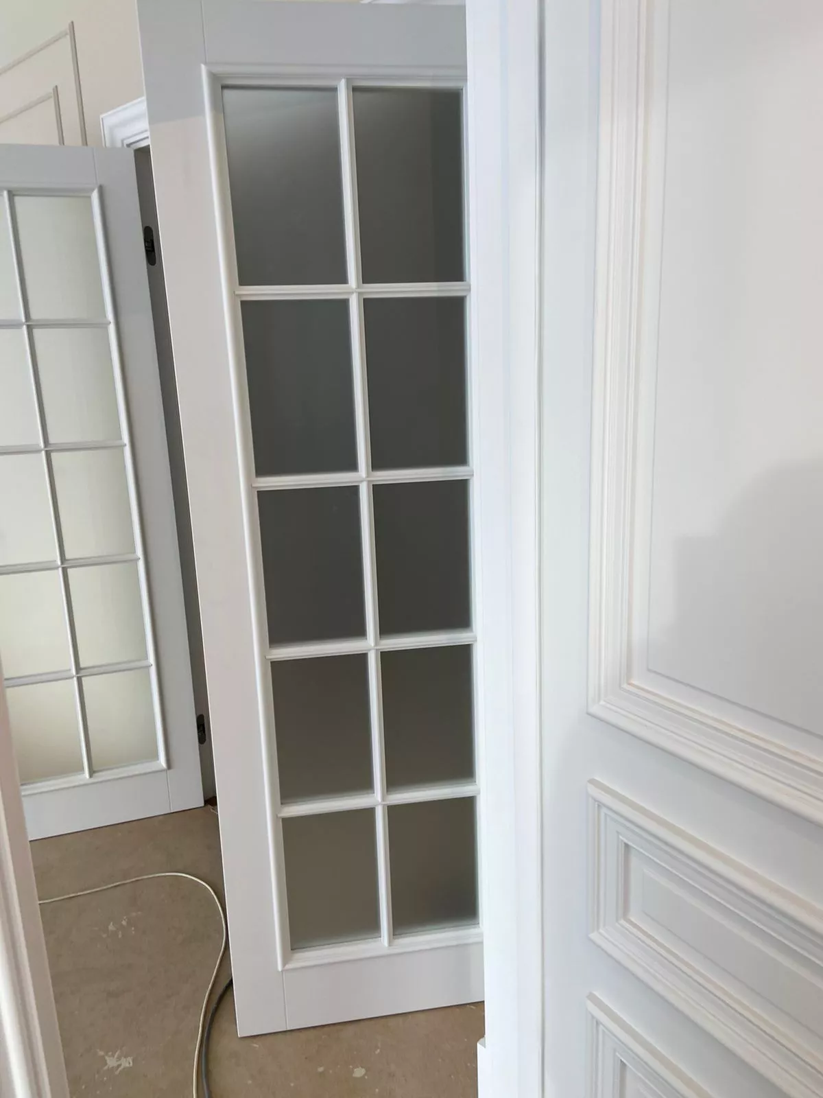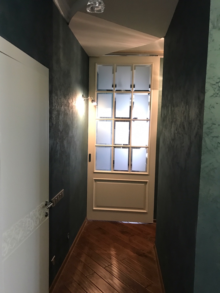 Полотно тамбуратное из инженерного массива (МДФ + ламельный/листельный массив лиственных пород) толщиной 50 мм. с повышенной шумоизоляцией,окра шенное матовыми красками итальянского производства SIRCA с эффектом «soft touch» по шкале RAL с возможностью двусторонней окраски. Объемные филенки, стекла крепятся к полотну с помощью фигурных штапиков (багетов).