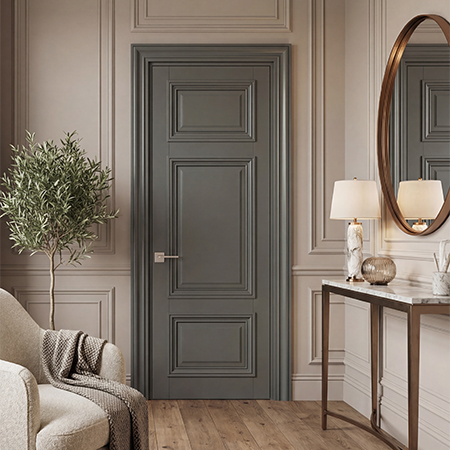 - Монолитные двери: Представляют собой сплошную гладкую панель без каких-либо декоративных элементов. Они идеально подходят для минималистичных интерьеров, где важен акцент на простоте и чистоте линий.
